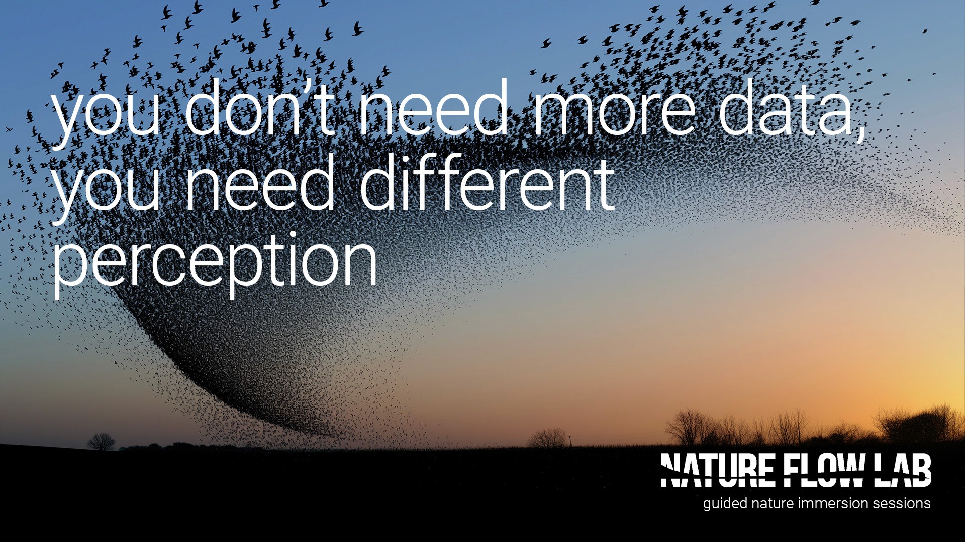 The key visuals blend real imagery of flocking birds with tech-inspired dot patterns — illustrating the connection between natural processes and innovative insights.